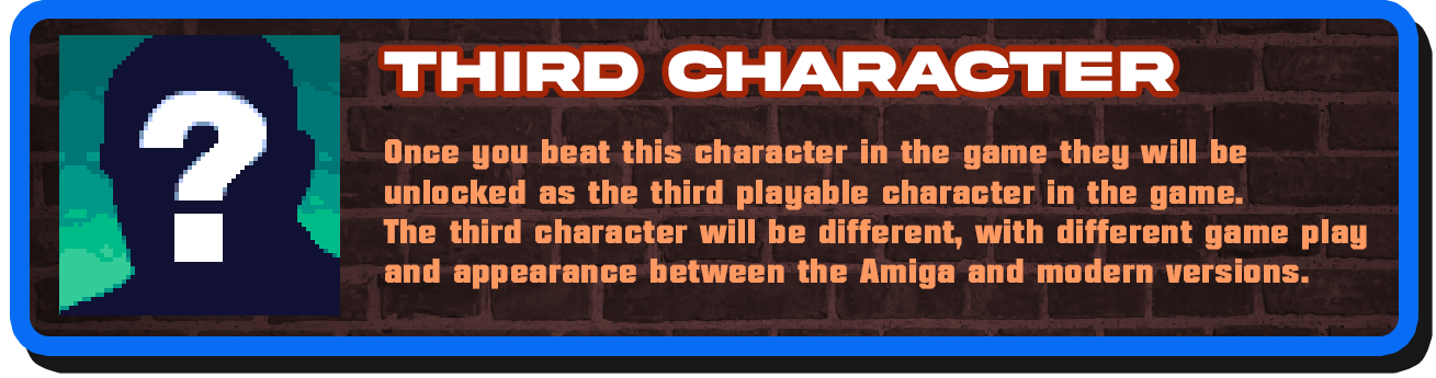 All versions will have the same core three playable characters to choose from, but the alternate versions for each character will be different between the Amiga and Modern versions of Metro Siege. Both versions will have other differences in game play and boss fights so players can have unique play experiences with each.